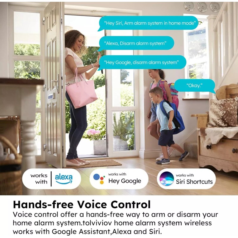 - ✅VOICE CONTROL - Your tolviviov alarm system for home can be easily controlled by Away, Disarm, and Home modes with your voice. Works with Alexa and Google Assistant. Only works on 2.4GHz WiFi networks, does NOT support 5GHz WiFi networks.