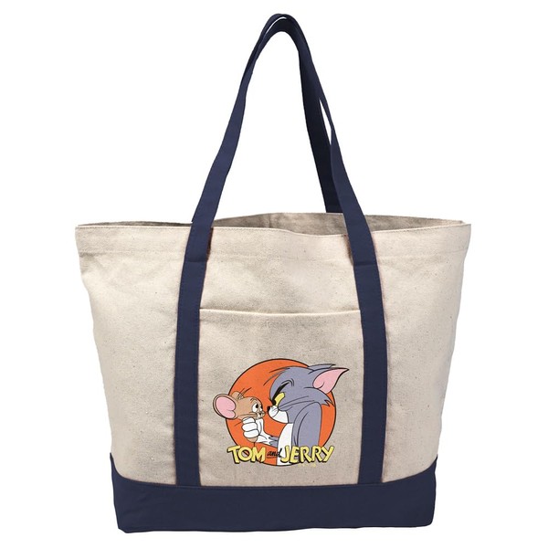 Tom and Jerry Characters Canvas Tote Bag With External Pocket, Reusable Shoulder Bag for Shopping, Beach, Navy