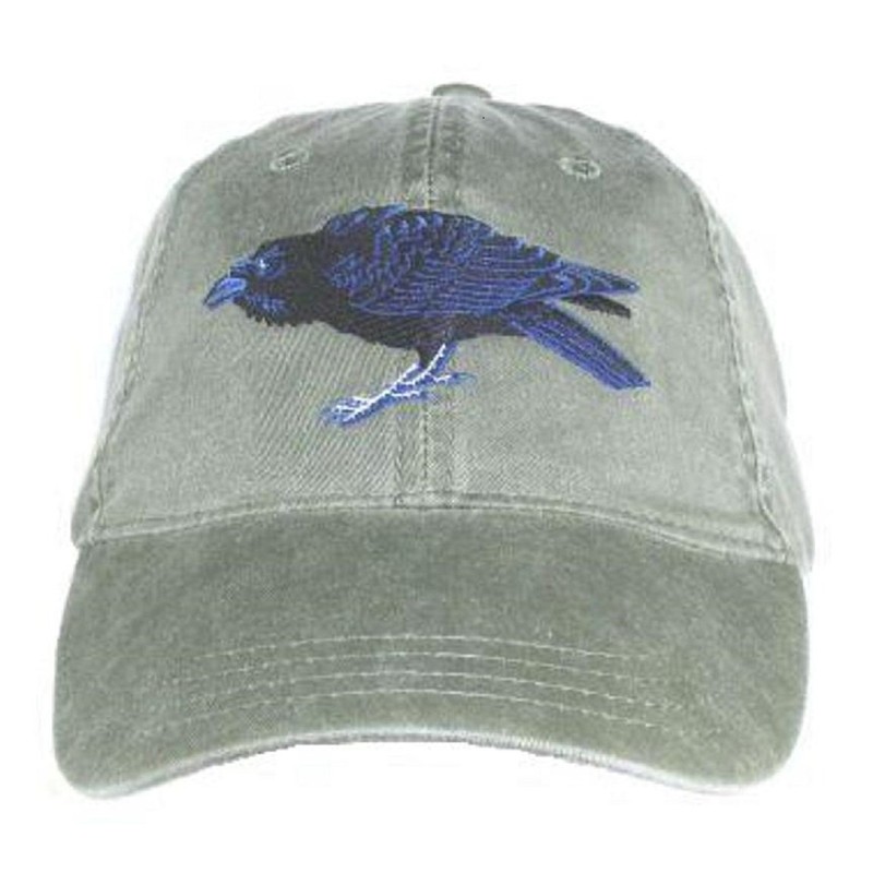 - Colorful embroidered design of a Common Raven on a new, high quality, 100% preshrunk cotton Khaki Green cap.