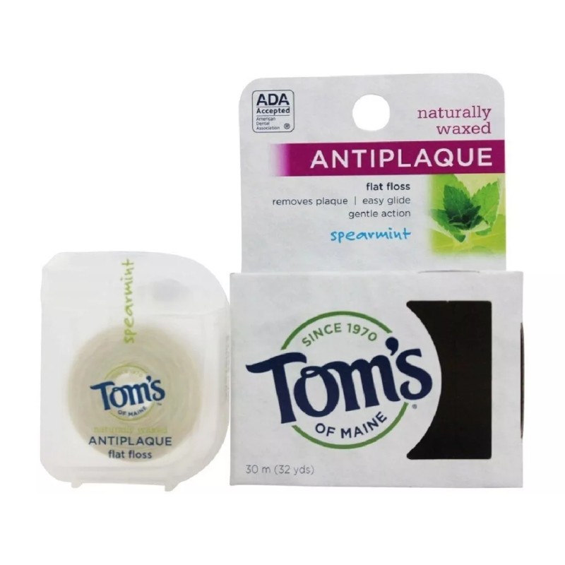 TOM'S OF MAINE SPEARMINT FLAT FLOSS IS 30 METERS OF A NATURALLY WAXED FLAT STRING OF FLOSS THAT'S BEEN ADA-ACCEPTED. THE ALL-NATURAL INGREDIENTS INCLUDE BEESWAX, JOJOBA WAX AND A NATURAL FLAVOR. THIS ANTI-PLAQUE PRODUCT IS MADE WITHOUT ARTIFICIAL COLORS, FLAVORS, FRAGRANCES OR PRESERVATIVES. IT'S BOTH KOSHER AND HALAL.