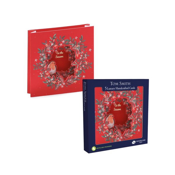 Tom Smith Pack 5 Luxury Handcrafted Square Christmas Cards Robin Wreath Design
