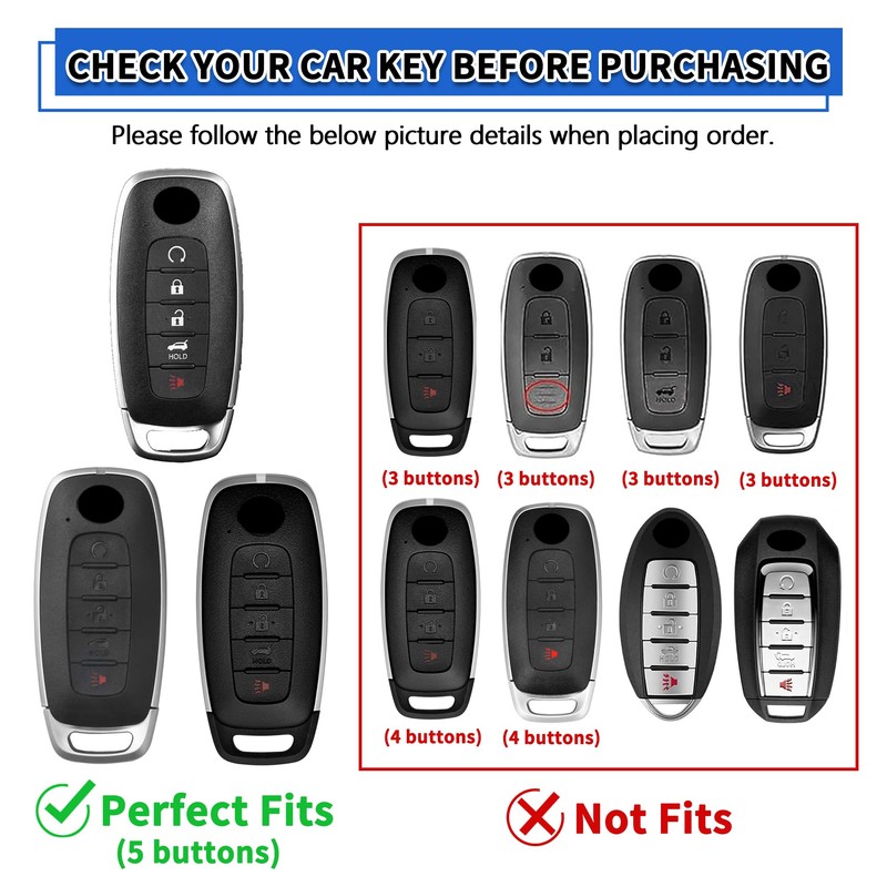 - 【APPLICABLE MODEL】The key shell case with key chain is fit for Nissan 2023 2024 2025 Rogue Pathfinder and 2024 2025 Sentra 5 buttons smart key fob remote control. (Or any other models same with the 2nd picture. NOTE: Please check carefully if your key has the same appearance as the key we provided in the 2nd picture before purchasing, it doesn’t fit flip/folding key.)