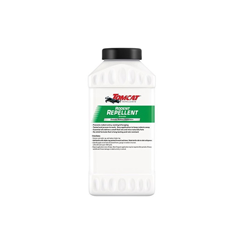 It is time to put a stop to unwanted visitors taking over your home. Tomcat? Repellents Rodent Repellent Granules prevents mouse and rat entry, nesting, and foraging outdoors. It is formulated with an essential oil blend that delivers a smell and taste rodents can't stand. Humans, on the other hand, go unbothered, as the formula is no-stink to us. In addition, the product is safe for use around kids and pets (when used as directed). Tomcat? Repellents Rodent Repellent is rain-resistant and long-lasting with an application that should be repeated every 30 days. No matter where you apply, Tomcat will be ready to protect. Apply this product liberally to the soil or turf around your home, garage, or outdoor structure. To use, hold bottle with shaker top pointed forward and down. Shake bottle side to side to dispense. This 2 lb. container of rodent repellent granules covers up to 1,000 sq. ft.