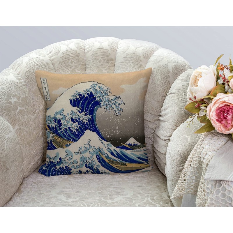 Tomda Hokusai The Great Wave Cushion Cover Throw Pillow Case Cotton Linen 45x45cm 18x18 Inch for Sofa Couch