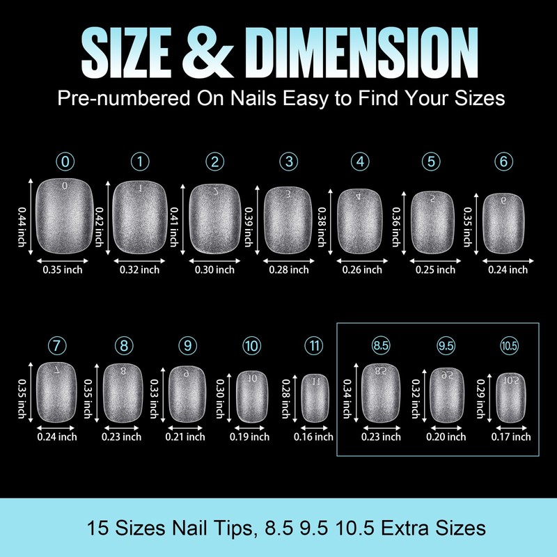 - 15 SIZES, 360PCS: Extra short nail tip has 15 sizes of nail tips totaling 360 pieces. In addition to the common 12 sizes, we have added 3 additional sizes so you can find the best size nail tips. The gel nail tips are marked with numbers at the top to help you find the suitable tips more easily.