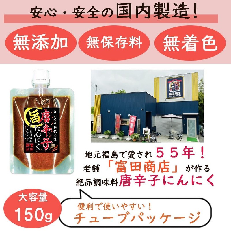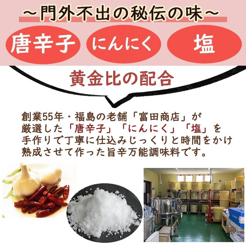 - Chili pepper garlic has been used for 55 years. This masterpiece is made by the long-established Toyota Shoten in Fukushima