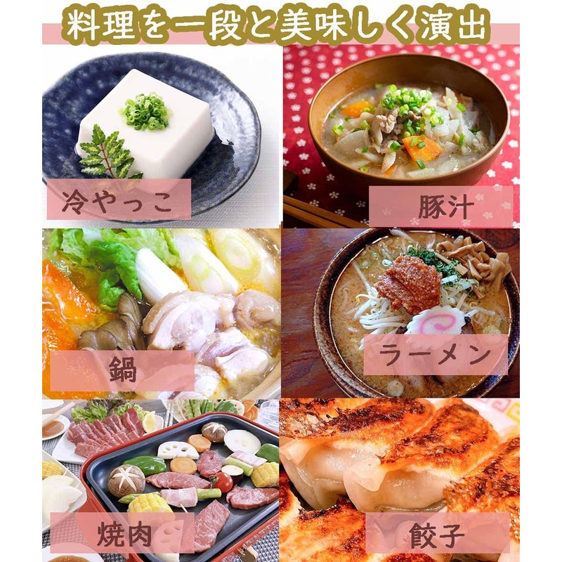 - Roasted meat, steak, baked onigiri, pork juice, fried noodles, stir fried noodles, stew, hot pot, chilled noodle, noodle, boiled buckwheat, den, boiled moths, salad, curry, chilfry... Perfect for everything from main meals to side dishes and snacks