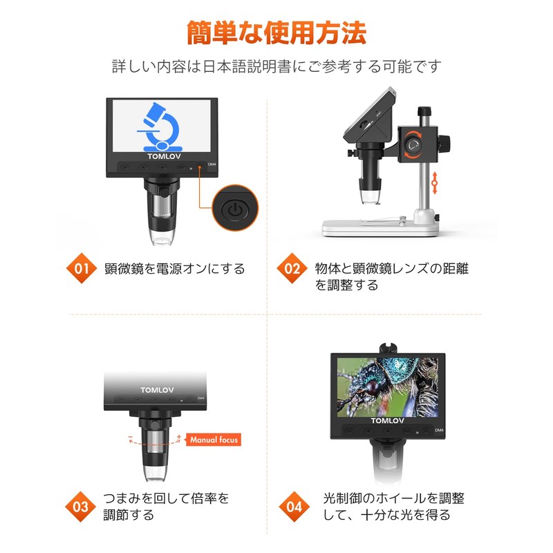 • 8 LED Lights: The digital microscope has 8 adjustable LED lights that provide sufficient even lighting. You can freely adjust the brightness by rotating the button, ensuring the specimen is clear and bright. It helps to take photos and record videos when observing trees and insects in the forest or dark areas. TOMLOV DM4 Microscope brings you a great experience