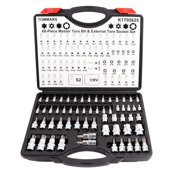 TOMMARS 60-Pc Master Torx Bit Socket and External Socket Set 1/4", 3/8", 1/2" Drive, S2 Steel Bits, CRV Sockets E4-E24, T6-T70,TT6-TT70,TP8-TP60