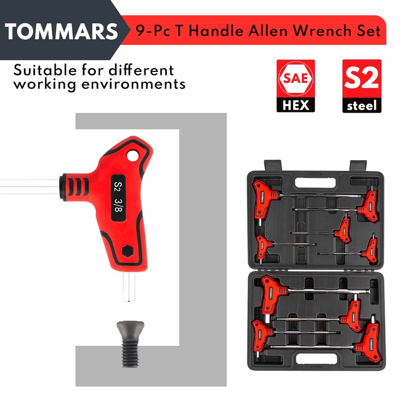 TOMMARS 9PC T Handle Allen Wrench Set, SAE T Handle Hex Key Set Ball End, SAE 5/64-3/8 inch, S2 Steel