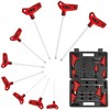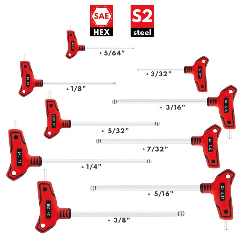 - T-handle hex key set includes: 5/64" - 3/32" - 1/8" - 3/16" - 5/32" - 7/32" - 1/4" - 5/16" - 3/8"