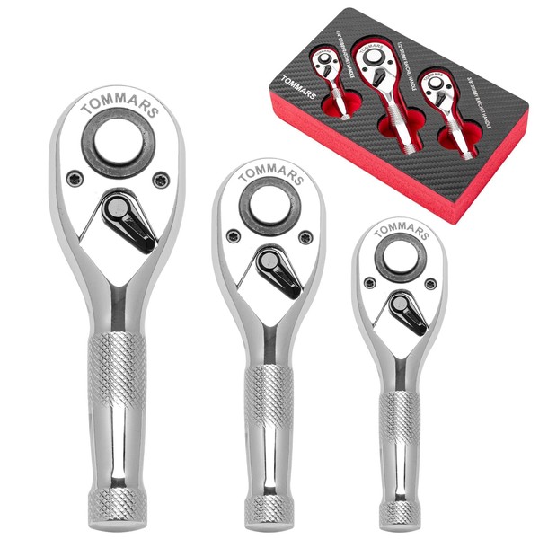 TOMMARS Stubby Ratchet Set, 1/4", 3/8", 1/2" Drive Ratchet Handle Wrench 72-Tooth Quick-Release Reversible