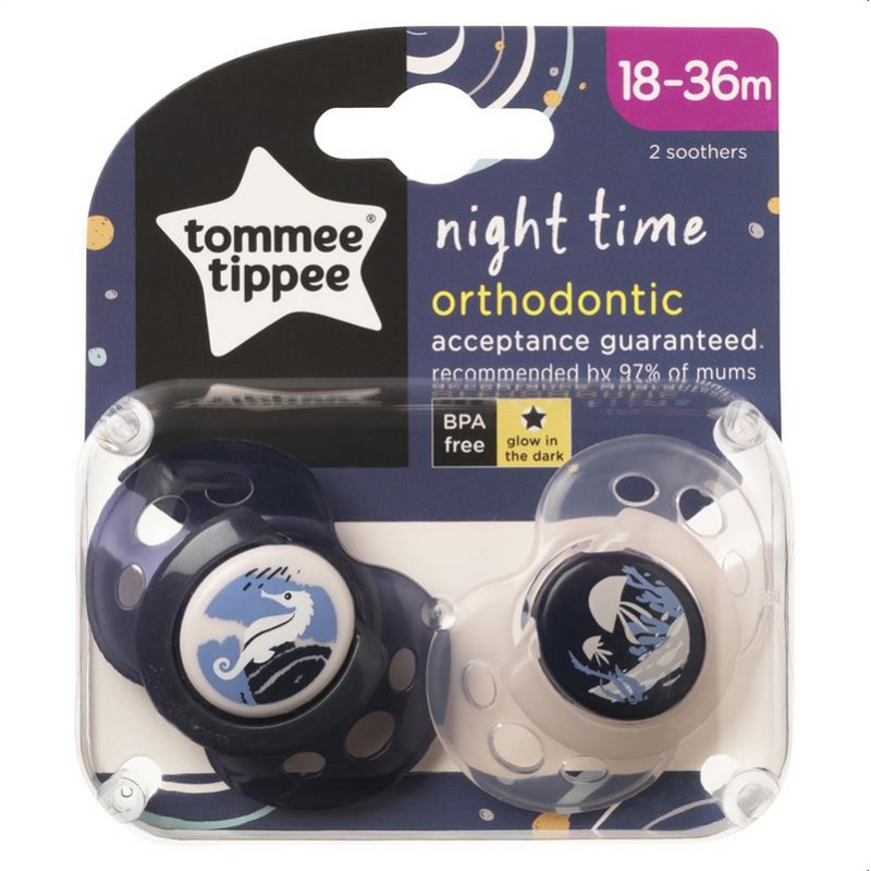 Boxed Contents: 2 x Night Time Soothers 18-36m