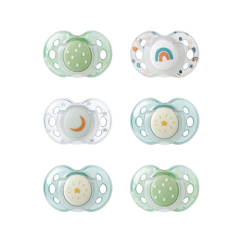 Tommee Tippee Night Time Pacifier, 18-36 Months, Symmetrical Silicone Baglet, BPA-Free Binkies, Glow in The Dark Technology, Green Rainbow, Pack of 6