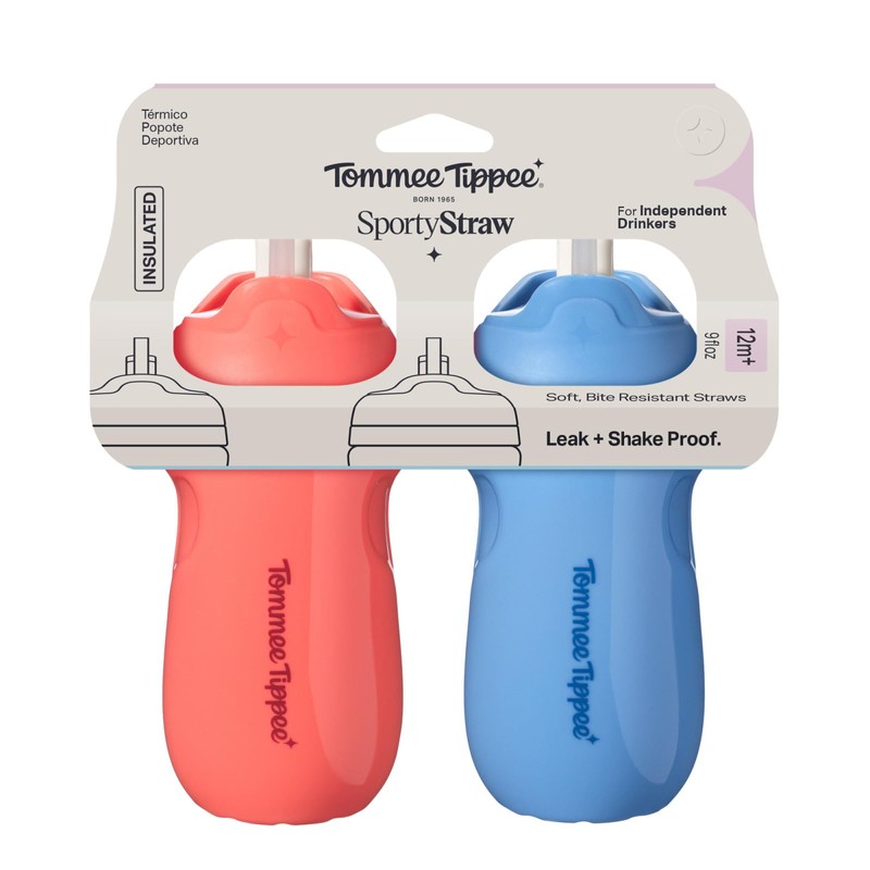 Tommee Tippee Tommee Tippee Sporty Straw Bottle, 9oz, Spill Proof Toddler Water Bottle for 12 Months+, Flip Lid Helps Keep Straw Clean, Blue and Red, 2 Count