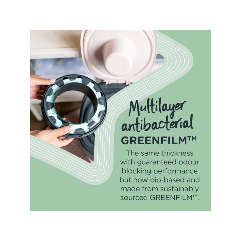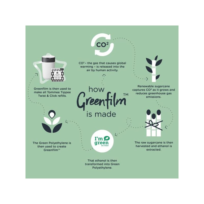 - Now more eco-friendly: The Twist & Click nappy bin and refill cassettes are made from 98% recycled and fully recyclable plastic. Our multi-layer antibacterial film is now bio-based and made from sustainably sourced sugar cane GREENFILM.