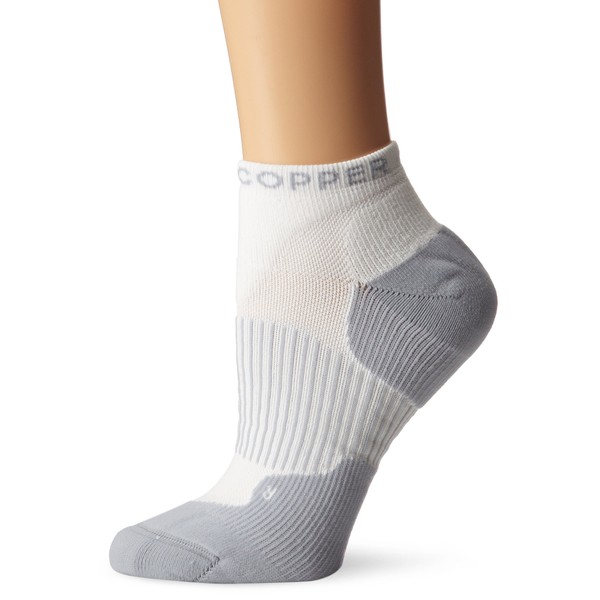 One of the most technologically advanced socks, the Tommie Copper Men's Performance Compression Ankle Socks have it all. Tommie Copper is the leader and originator of copper-infused apparel, offering comfortable compression apparel, sleeves, socks, and orthotics designed for everyday wear. Its 1x1 mesh assures breathability and moisture wicking, while the seamless toe and contoured cushion fit to maximize comfort. Targeted arch support and extra padding in stress areas round out this versatile, hard-working sock. The contoured cushions at the heel and toe are designed to fit the form of the foot for extraordinary comfort and decreased impact. A seamless toe eliminates friction at pressure points while targeted arch compression provides muscle support. The patented Copper Znergy technology prevents the growth of odor causing microbes on the fabric. Style Number: 1703W Size: 7–9.5 Color: White