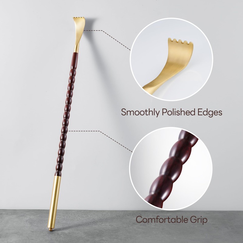 - Rosewood & Brass Build: Crafted from premium rosewood with a rich natural grain and finished in safe oil, this back scratcher offers durability without splinters. The real brass head and handle provide a satisfying weight and a smooth, cool touch.