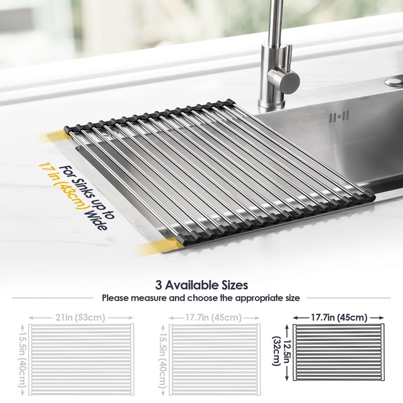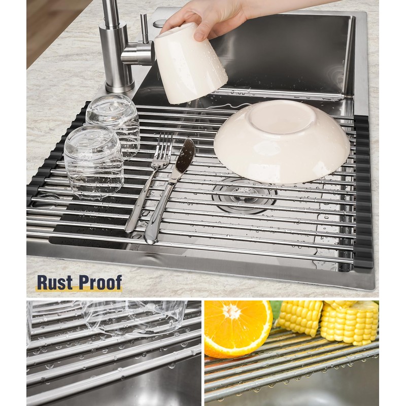 Tomorotec 17.7" x 12.5" Roll Up Dish Drying Rack Over Sink Drying Rack Sink Cover Kitchen Sink Accessories Gadget Multipurpose Organizer Foldable Stainless Steel Drainer