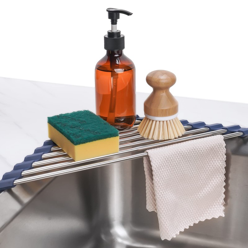 Tomorotec Triangular Roll Up Dish Drainer for Sink Corner Small Foldable Stainless Steel Over Sink Multipurpose Kitchen Drainer Caddy Trivet Storage Space Saving Shelf