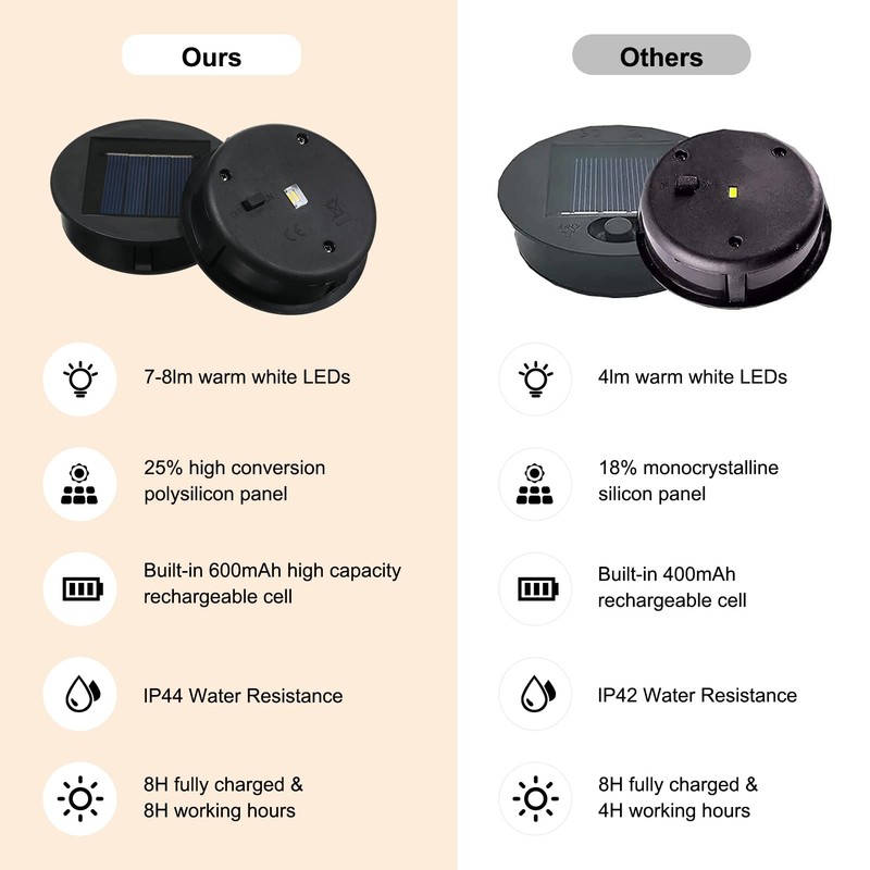 - 【Better Performance】2V100mA polysilicon solar panel with 25% high conversion, equipped with 1pcs 7-8lm warm white LEDs, toggle the switch to "ON" position at the bottom before use.
