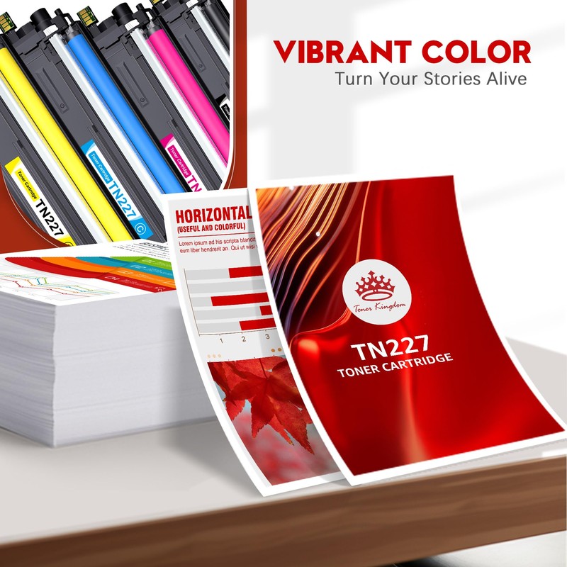 - Advantages: Toner Kingdom TN-227BK/C/M/Y, TN-223BK/C/M/Y High Yield Toner Cartridge has a higher printing quality than others, resisting fading, smudging, and blurring as well as bringing you dependable printouts