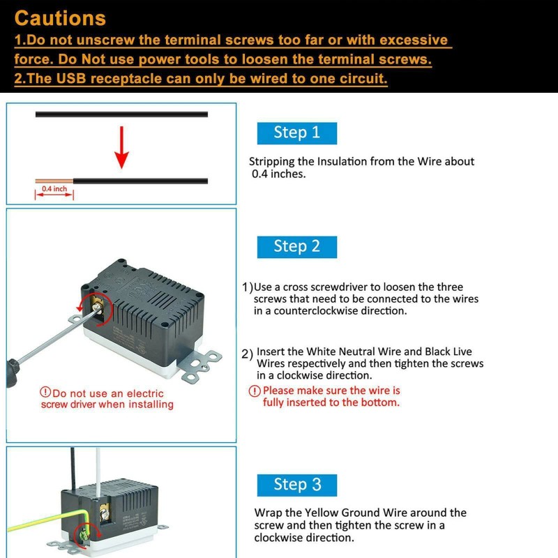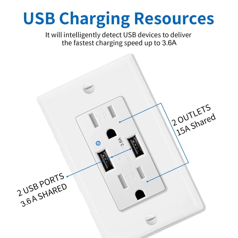 -USB power outlet has two USB ports with a total output of 5VDC, 3.6A (Does not support fast charge technology).Receptacle rating: 15A, 125VAC. -Charges two USB devices without adapters and leaves two outlets free for other power needs; -Tamper-resistant shutters to prevent unwanted objects from being inserted; -Back and side wired for easy installation. Not for switched outlets. Two 1-gang standard decorator wall plates included. UL-listed; -Safe & Efficient Charging with Intellichip This USB outlet is equipped with a smart Intellichip, which reads the power needs of devices connected to the USB ports to deliver optimal power. Intellichip charges at the optimal power allowed by the device, so your devices are protected from overcharging and overheating.  UNIVERSAL COMPATIBILITY