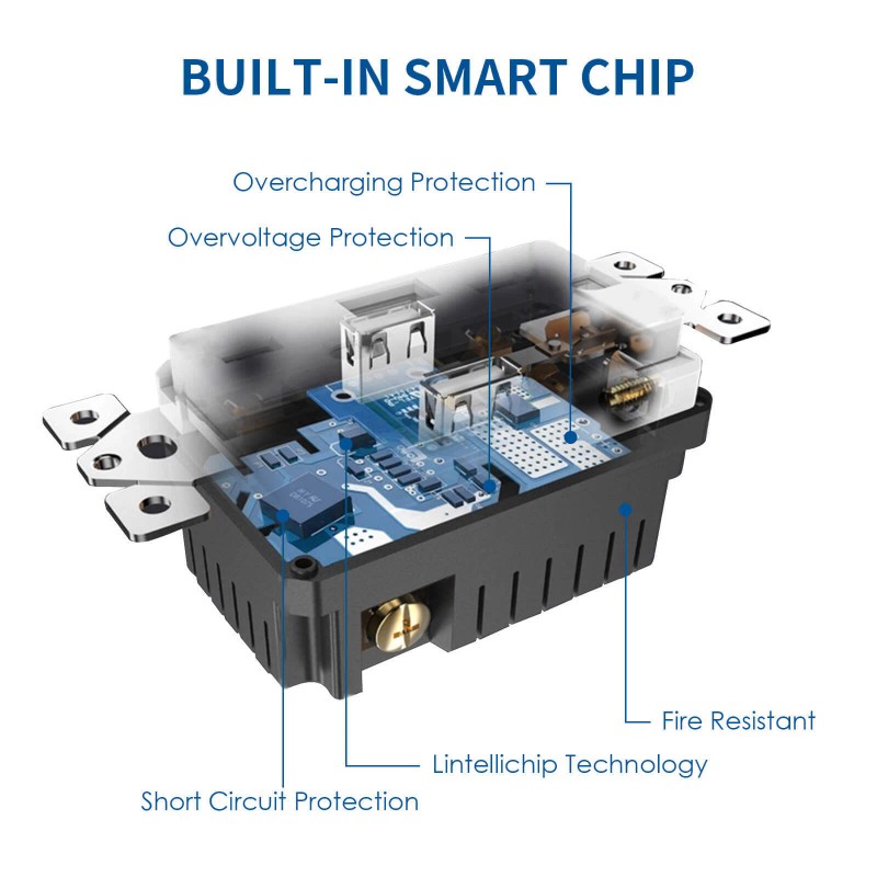 This USB outlet is equipped with a smart Intellichip, which reads the power needs of devices connected to the USB ports to deliver optimal power. Intellichip charges at the optimal power allowed by the device, so your devices are protected from overcharging and overheating.