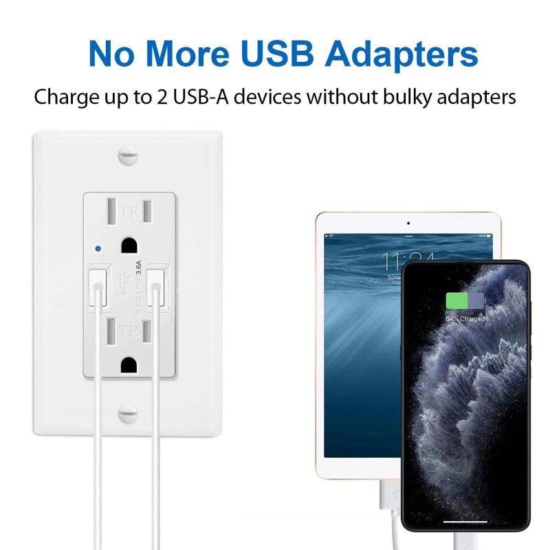 Charging two USB devices simultaneously without any other power adapters and leaving two 15A Tamper-Resistant AC power outlets free for other power needs.with a maximum 3.6A output when both USB ports are in use. Charging is now more convenient and efficient. (Please note that the USB ports do not support Qualcomm Quick Charge)