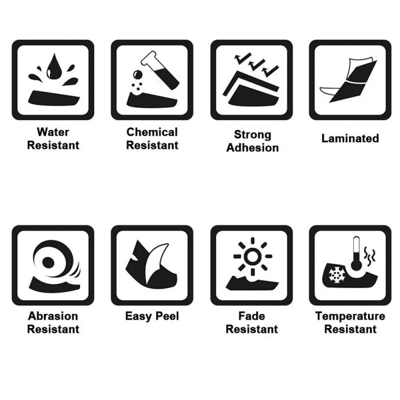 Features: Fade resistance ; Water resistance ; Abrasion resistance ; Chemical resistance ; Temperature resistance
