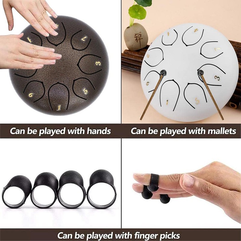 - More ethereal sound: 6-inch steel drum, 8 notes in the standard key of C. The circular vibration of the air and the drum body creates sounds of different rhythms. The sound reverberates through the air, more sustained and ethereal than the echoes of other instruments, giving you a feeling of deep relaxation and pleasure.