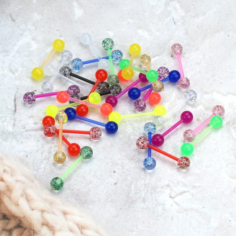 Tongue Piercing Set, 1.6 mm, 14G Tongue Piercing, Plastic, Reusable, Piercing Tongue, Nipple Piercing, Plastic Set with Luminous Effect, Acrylic Tongue Piercing Balls, Lightweight, Comfortable,