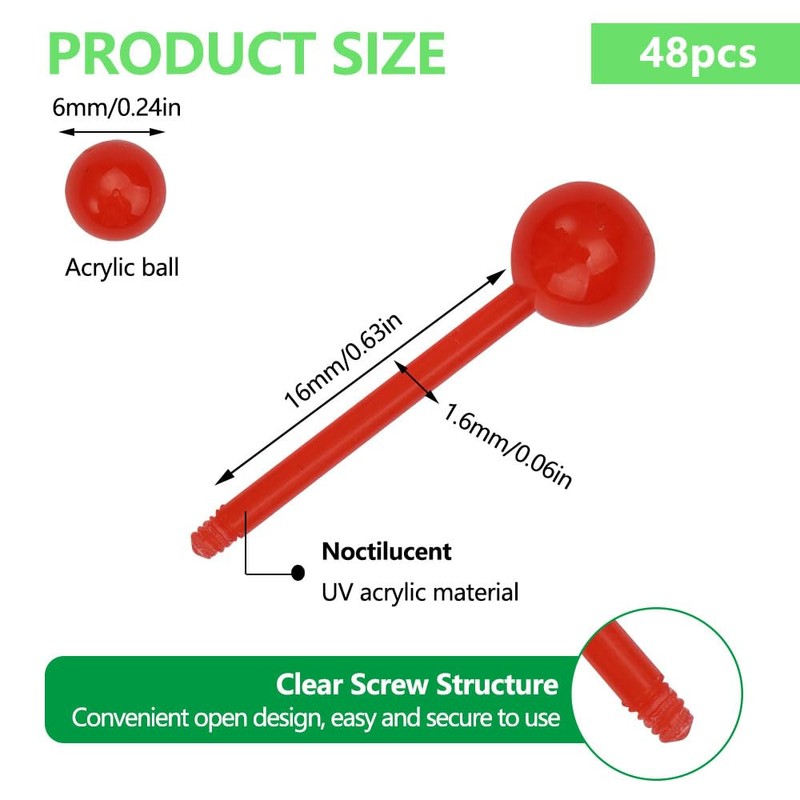 - Plastic acrylic tongue piercing dimensions: the set contains 48 acrylic tongue studs in a total of 16 colours. Of these, 8 colours have a luminous effect. The length of the middle bar of each plastic tongue piercing is 16 mm / 0.63 inches, and the diameter is 1.6 mm / 0.06 inches. The diameter of the balls at both ends is 6 mm / 0.24 inches