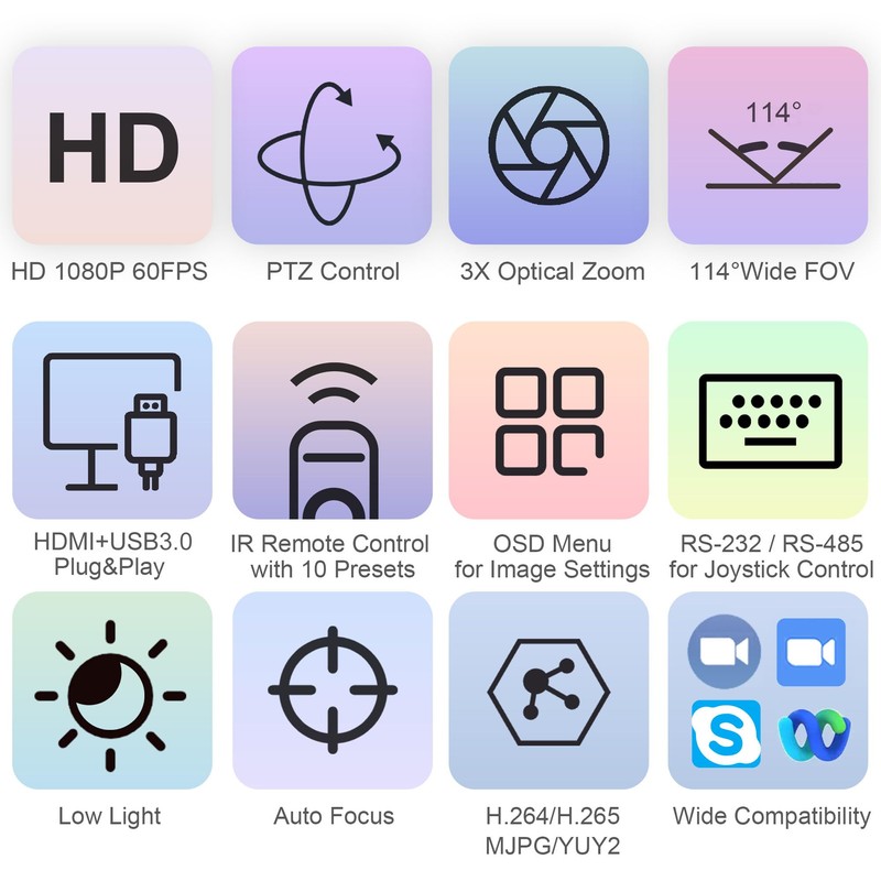 - ✔Multiple installation options and Package list - Available to install on the desk, wall, monitor, tripod, or ceiling. Package includes 1 * PTZ Camera, 1 * IR remote control, 1 * 9.8ft USB 3.0 cable, 1 * DC 12V/2A power adaptor, 1 * wall bracket with screws, and 1 * manual.