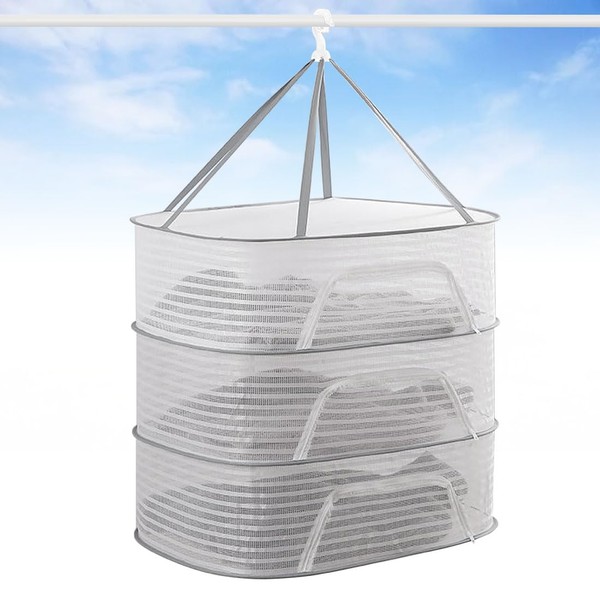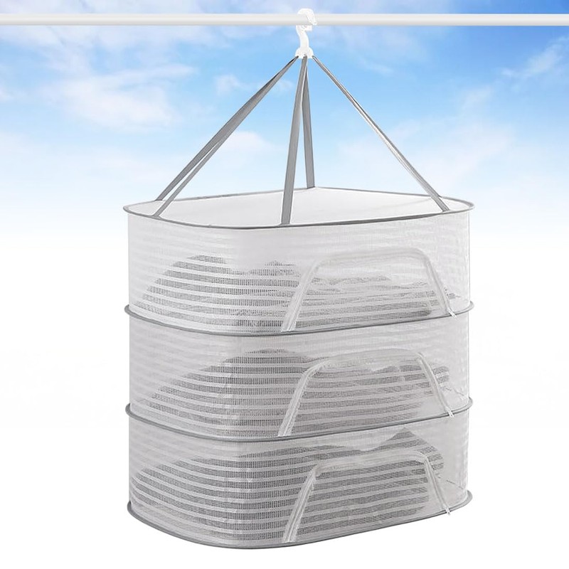 - Adjustable Height for Compact Storage: The length of the cord is adjustable. You can adjust the length by pulling the string on the bottom of the hook and fixing it with a clip. Also, 6 strings between each net are also used for extra durability per tier. Folds up compactly, so you can easily store it in a band or storage pouch when not in use. Recommended for those who do not frequently use a flat dry net or have no storage space. When folded, it can be compact up to 10.6 inches (27 cm) in diameter, and can be stored in small spaces. Perfect for those who want to use it for travel or business trips. It will not accidentally open anything that can be secured with a band or a storage pouch