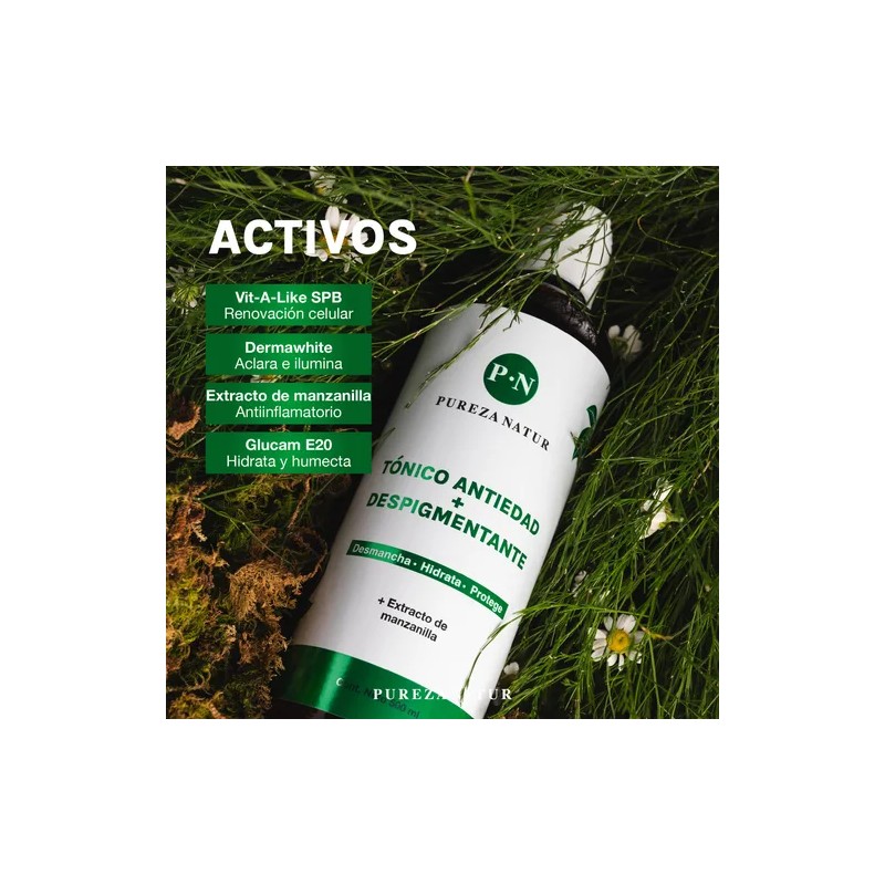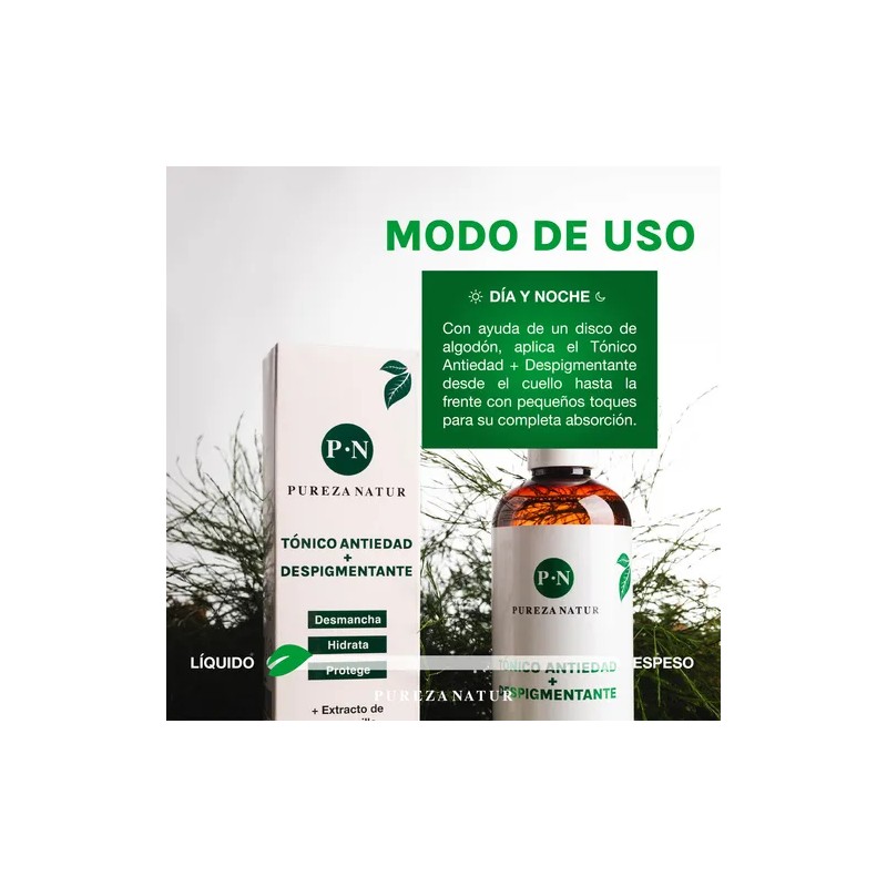 USOS Y APLICACIONES: Para uso de día y de noche. Lava tu rostro con jabón neutro. Aplica el TÓNICO ANTIEDAD + DESPIGMENTANTE sobre rostro y cuello dando pequeños toquecitos hasta absorber. Después aplica el Serum PUREZA NATUR y la crema que esté dentro de tu rutina facial.