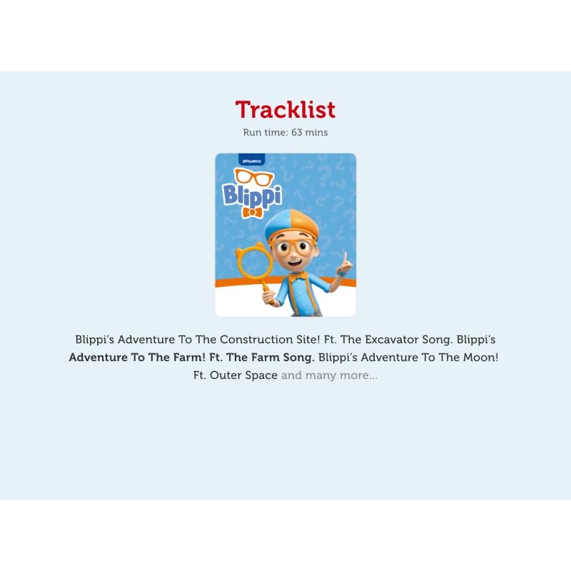 - This educational Tonie follows YouTube favourite Blippi and his friend Meekha on a road trip to locations including a farm, a construction site, and the moon. It features facts about each location.
