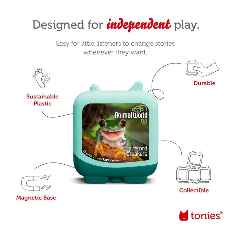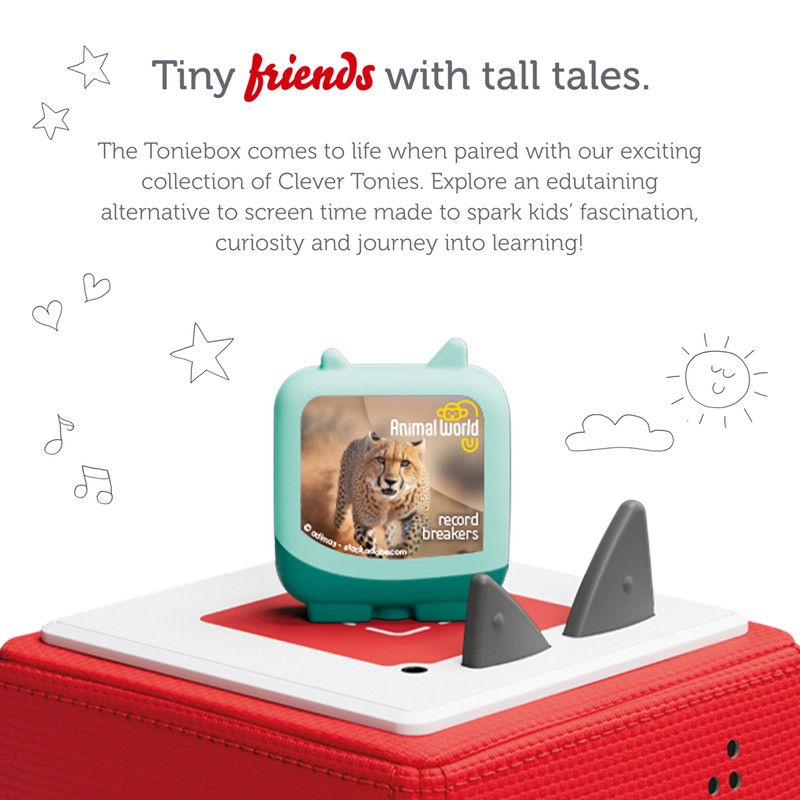 - Includes 4 Animal World: Record Breakers Clever Tonies in 1 set. Each Tonie contains 1 audiobook (25-30 minutes) for a total of 100 minutes content per set. Recommended Age Range: 5+, Language: English.