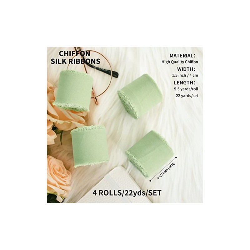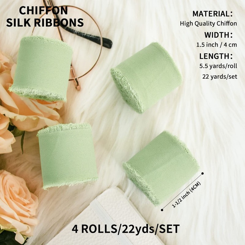 TONIFUL 4 Rolls 1-1/2 Inch Sage Green Lime Green Chiffon Silk Ribbon 22yds Handmade Fringe Chiffon Ribbons Set for Wedding Invitations, Bridal Bouquets, Gifts Wrapping, DIY Craft (sage, 22yds, 1.5")