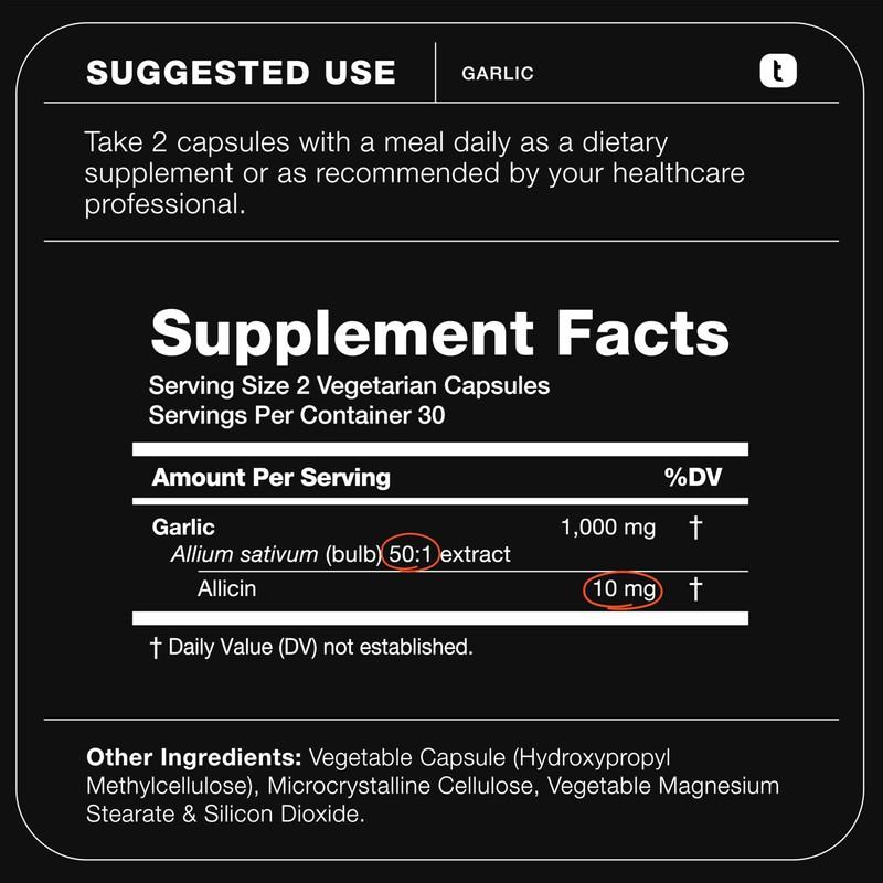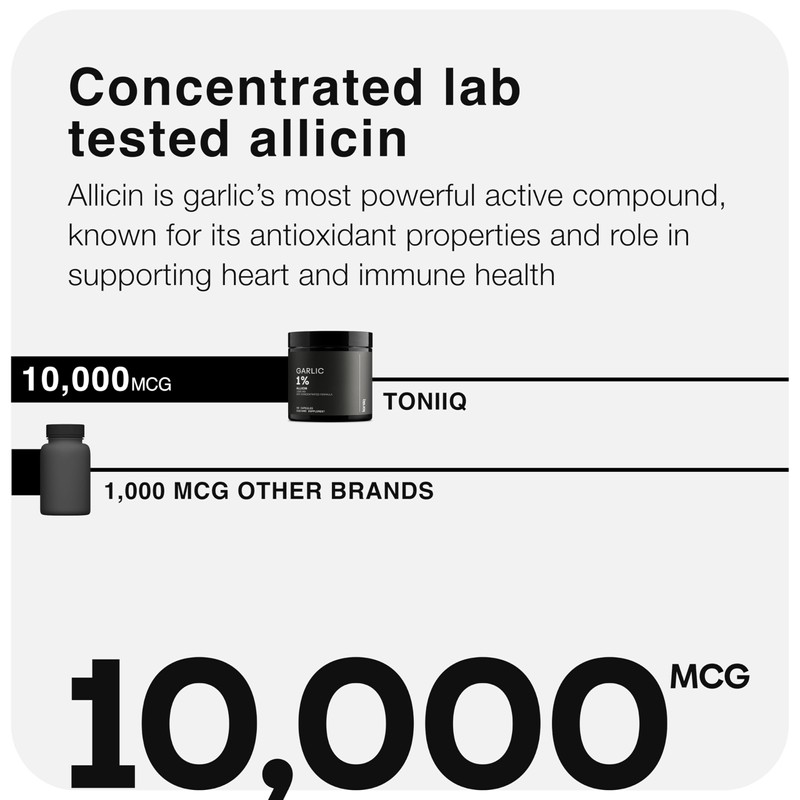 - 10mg Allicin, the Key Active Compound - Our garlic extract is standardized to 1% allicin, delivering 10mg per servinga higher concentration than most garlic supplements. Allicin is the most researched compound in garlic and is known for its wellness-supporting properties.