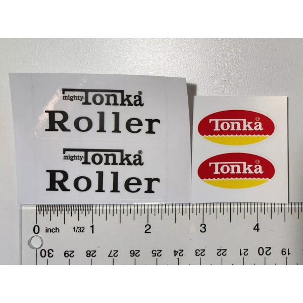 Set of replacement stickers for Mighty Tonka Roller. Black lettering is on a clear background. Includes two 1974-1975 oval logos. Easy to apply peel and stick.