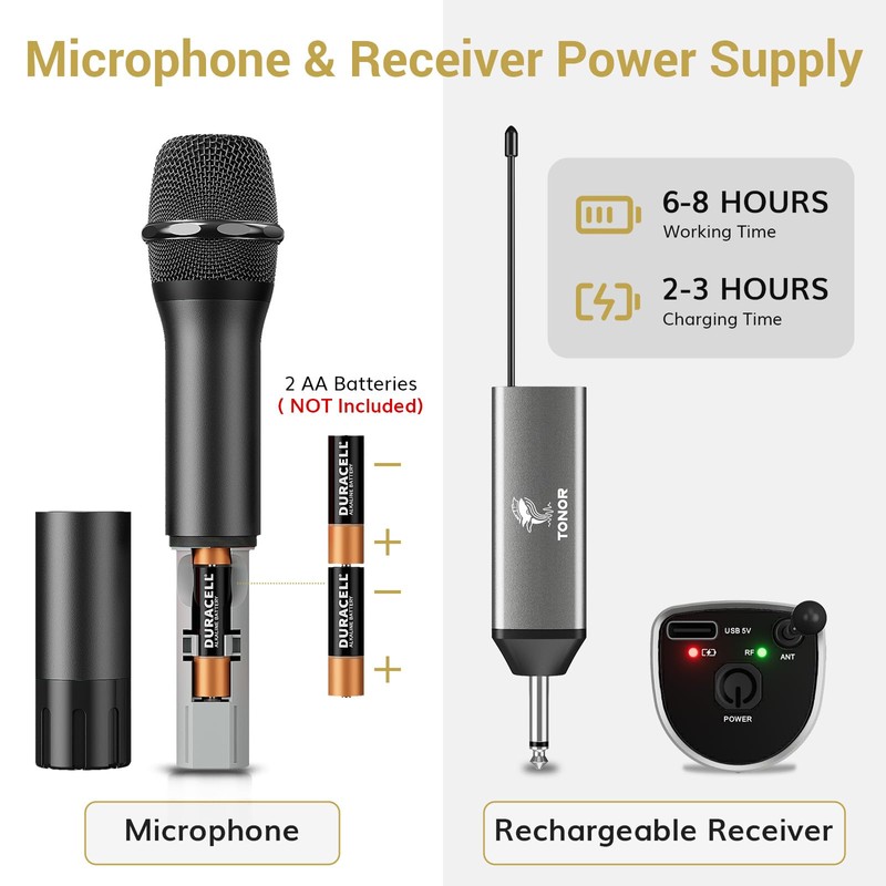 TONOR Wireless Microphone, UHF Metal Cordless Handheld Mic System with Rechargeable Receiver, for Karaoke, Singing, Party, Wedding, DJ, Speech, 200ft (TW620), Black