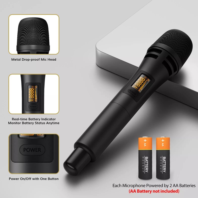 - Long Working Time: Each microphone is powered by 2 AA batteries to ensure its long working time (AA Batteries NOT INCLUDED). The receiver with a 1500mAh built-in rechargeable battery for 5-6 hours of continuous use with just 2-3 hours of charging. Made of metal paint and ABS plastic, this microphone is lightweight for on-the-go use. The display screen shows battery and signal strength for optimal performance.