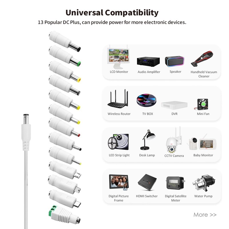 - Wide compatibility: LED strips, USB hubs, cameras, tablets, power banks, speakers, MP3 players, webcams, routers, toys, scanner, voice recorder, DVR, portable DVD, VoIP phone router, mobile phone, home phone system, Bluetooth speaker, hard disk box, shaver, sonic toothbrush, label printer, nextbook, Bluetooth speaker, home phone system, LED pixel light, fairy lights, smartphones, webcam router, VoIP phone router, CD player, car recorder.