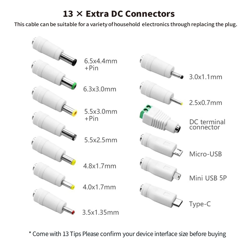 - DC Adapter Plug: A brand new 13-piece power supply is used for external universal power supplies or transformers.