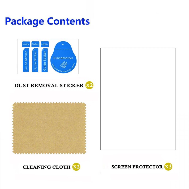 - Package included: 3-Pack screen protectors, Dust Removal Sticker, Microfiber cloth