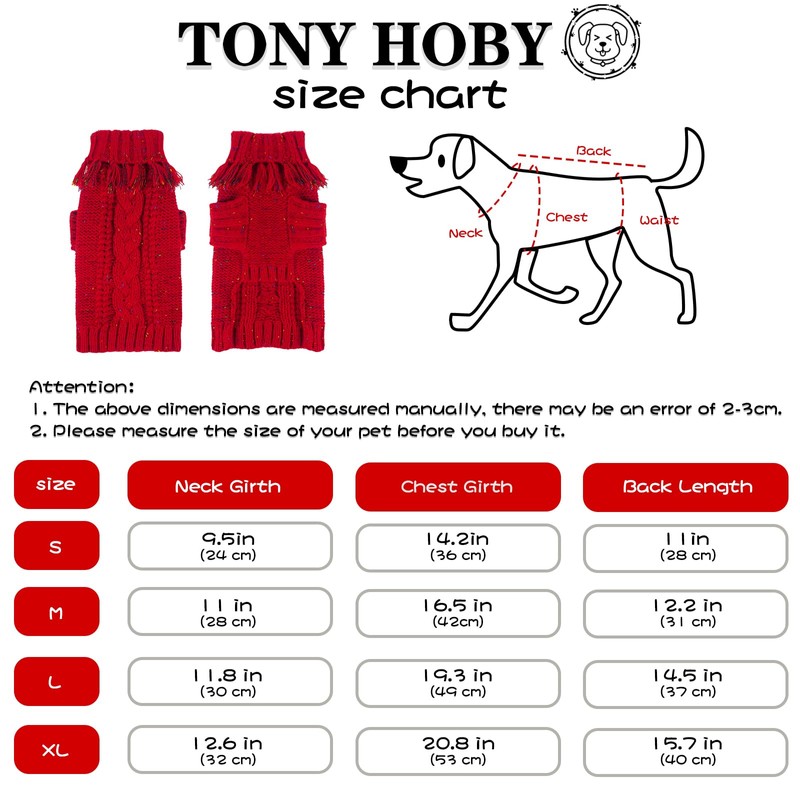 • 【Size】- TONY HOBY Dog Sweater Large Chest Girth is 19.3", Back Length is 14.5", neck girth is 11.8". If your dog's size is between two sizes, please choose the larger size