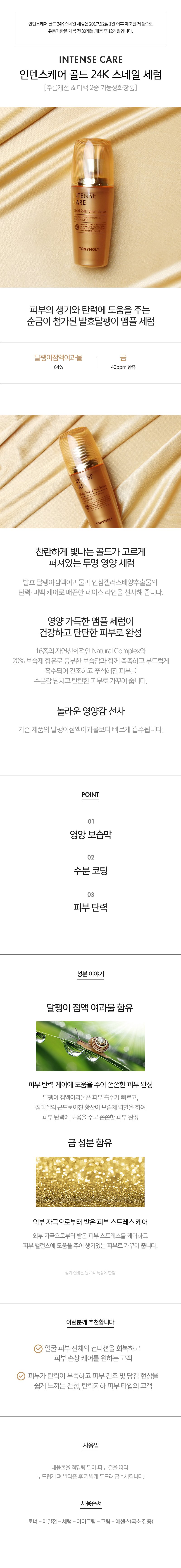 - All ingredients: Yeast/snail mucus fermentation filtrate (64%), glycerol-26, purified water, dipropylene glycol, glycerin, niacinamide, PEG/PPG-17/6 copolymer, trehalose, lime seed oil , lemon peel oil, bergamot oil, sucrose palmitate, orange peel oil, pine leaf oil, eucalyptus leaf oil, glyceryl caprylate, tangerine whole plant extract, cochineal cactus fruit extract, soleirolia soleirolii extract, lotus leaf extract. , Jeju soybean extract, Chopi tree fruit extract, pasqueflower extract, mistletoe extract, green tea extract, centella asiatica extract, mugwort extract, yeast fermentation, mountain mulberry leaf extract, propolis extract, coptis root extract, Usnia extract, ginseng callus culture. Extract, polyglutamic acid, acetyl heptapeptide-9, RH-olicopeptide-1, gold (40 ppm), gold colloid (20 ppb), bis-PEG-18methyl ether die