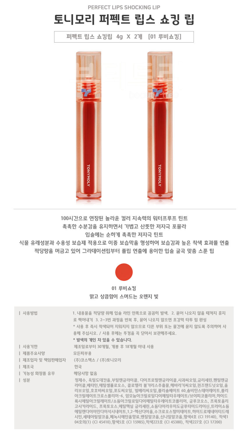 Tony Moly Perfect Lips Shocking Lip 01 Ruby Shocking X 2 / 토니모리 퍼펙트 립스 쇼킹 립 01 루비쇼킹 X 2개