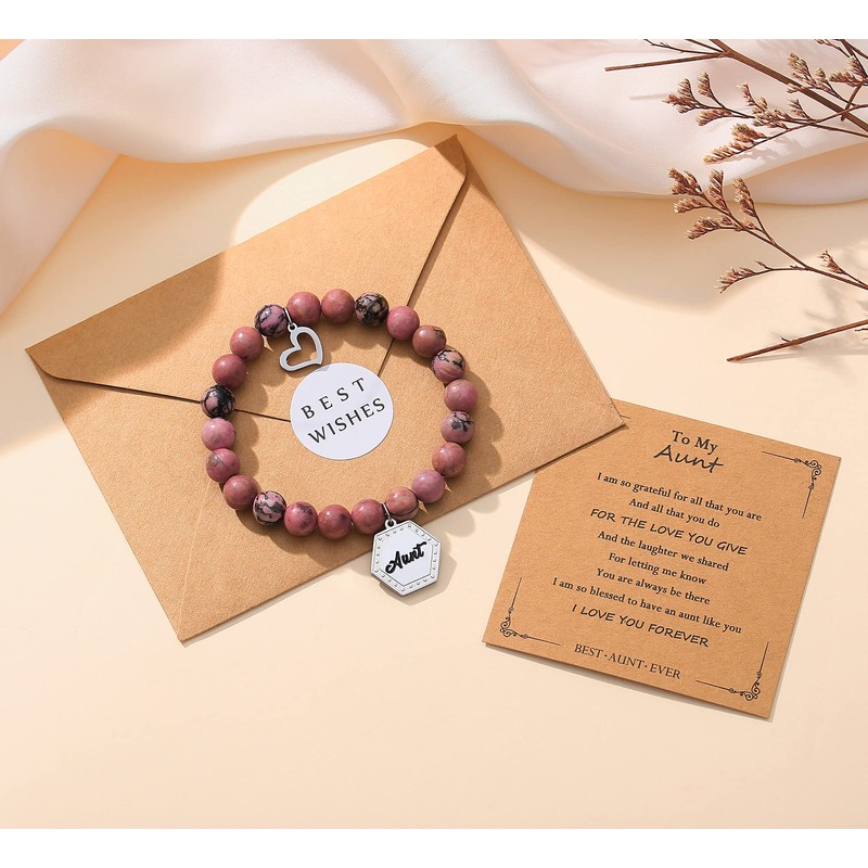 - 【 Aunt Bracelet 】This timeless crystal bracelet is 100% HANDMADE with 8mm high quality Rhodonite and strong stretchy cord, with the addition of a double-sided hexagon charm that engraved with "AUNT". Super elegant, aesthetic and comfortable! More attractive, Rhodonite is a gemstone of patience and love, promoting both compassion and self-love, makes it ideal for encouraging, gratitude and self-discovery. Great as best aunt ever gifts, aunt birthday gifts and Christmas gifts for aunt.
